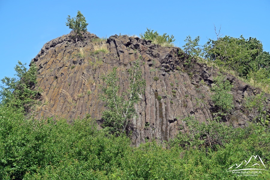 Docieramy do miejsca gdzie szlak skręca w lewo, a w prawo prowadzi nieoznakowana ścieżka. Włodek proponuje abyśmy właśnie skręcili w prawo i zrobili taką pętlę w obrębie szczytu. Tak więc ruszamy, a kawałek dalej pojawia się piękny widok na formację skalną budującą ten szczyt i przedstawiającą regularne słupy bazaltowe.