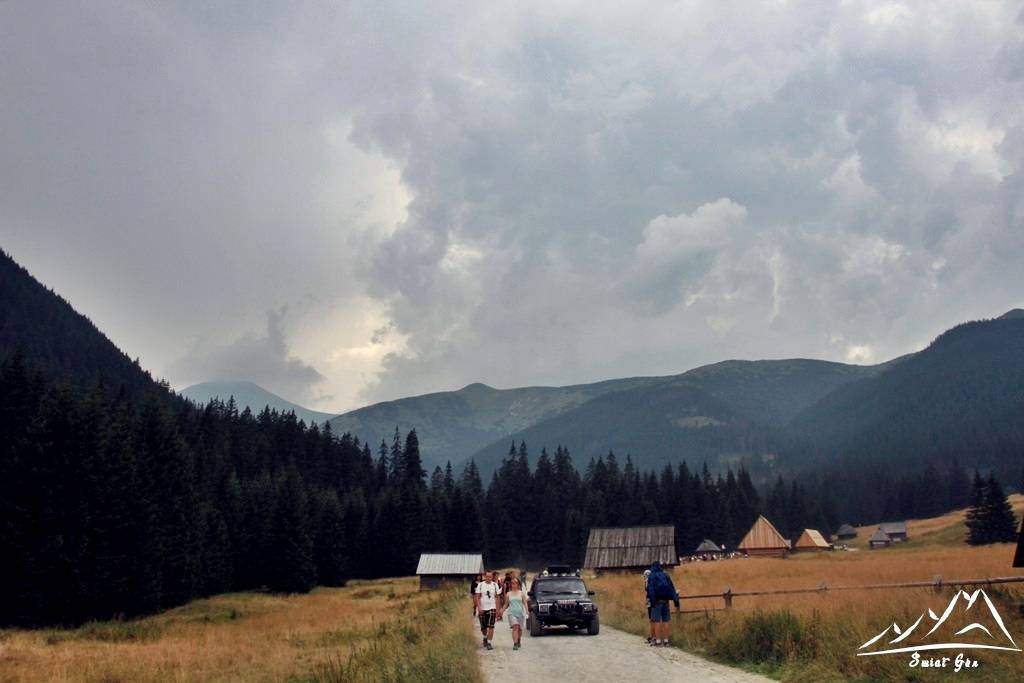 Po krótkiej przerwie w schronisku ruszamy w dalszą drogę. Szybkim marszem uciekamy przed burzą, którą słychać już coraz bliżej. Niestety przy Polanie Trzydniówka zaczyna padać deszcz, po chwili jednak ustaje, ale tylko na chwilę. Natomiast tuż przed Polaną Huciska, zaczyna lać już porządnie. Na polanie zebrała się spora grupa ludzi czekająca na kolejkę. My jednak decydujemy się żeby nie czekać na nią, gdyż i tak zapewne nie zmieścimy się. Dlatego też podejmujemy decyzję o wypożyczeniu rowerów żeby szybko przedostać się na Siwą Polanę. Zaczynamy zjeżdżać, deszcz pada bardzo mocno. Mamy na sobie kurtki przeciwdeszczowe – trochę to pomaga. Jednakże po chwili jesteśmy już cali przemoczeni. Nadciągnęła potężna ulewa, a my cali przemoczeni (od góry do dołu) mkniemy na dwóch kółkach w kierunku Siwej Polany.