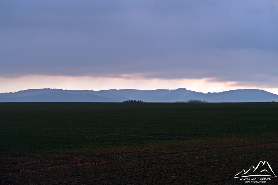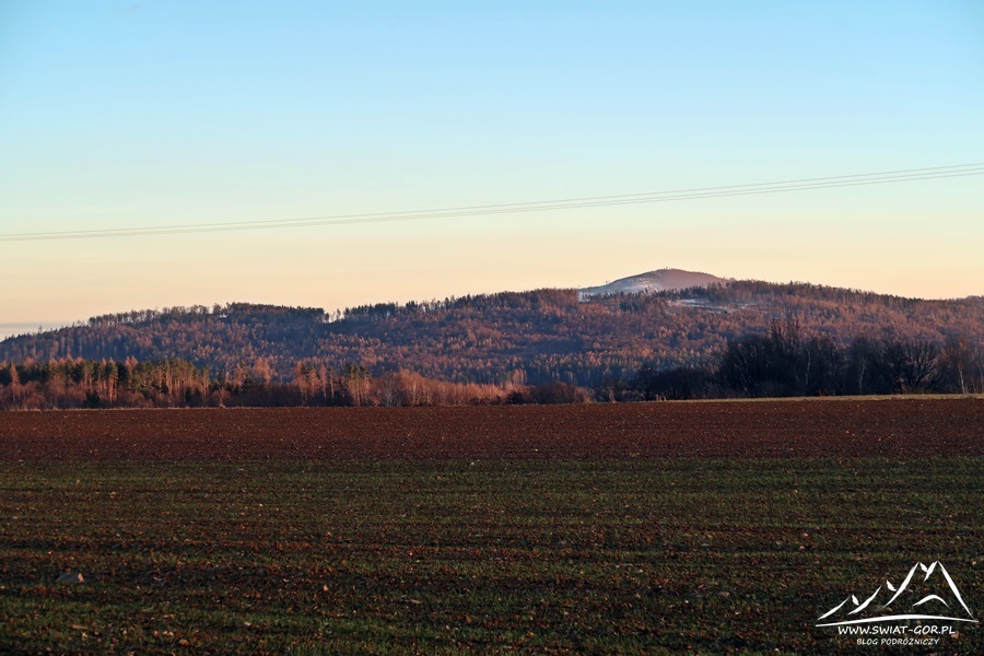 Wysiadam, zabieram plecak i ruszam na spacer na najwyższe wzniesienie Przedgórza Paczkowskiego po polskiej stronie. Na początek trasa prowadzi Głównym Szlakiem Sudeckim, z lewej strony towarzyszy mi widok na Biskupią Kopę (890 m n.p.m.) i Masyw Chrobrego, czy czeską część Gór Opawskich ze Zlatym Chlumem (891 m n.p.m.).