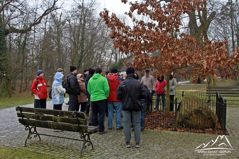 Nasz spacer rozpoczynamy przy tablicach, gdzie Wojtek opowiada nam fakty związane z dobrami książąt Hohenlohe-Ohringen. Niestety zaczyna padać śnieg, to nam jednak nie przeszkadza i ruszamy w stronę parku w Sławięcicach, w których znajduje się pozostałość dawnego pałacu. Wędrując po parku napotykamy pozostałości dawnej twierdzy. Oczywiście robimy sobie przy tych bunkrach zdjęcia aż docieramy do pozostałości dawnego pałacu.