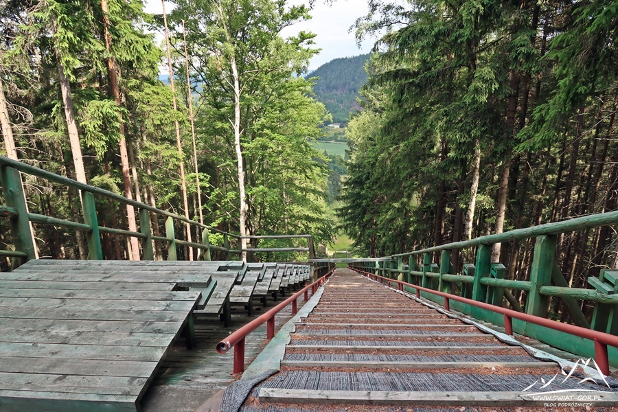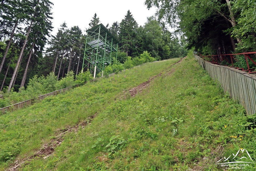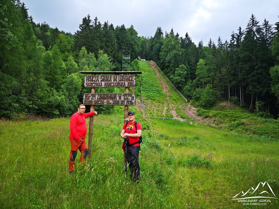 Po dotarciu na miejsce rozpoczynamy zejście ścieżką znajdującą się przy skoczni narciarskiej. Część grupy wymyka się, aby dokładniej przyjrzeć się obiektowi. W tym także i ja. Mam okazję, aby zrobić pamiątkowe zdjęcia na skoczni. Powoli schodzimy fotografując obiekt, aż docieramy do podnóża skoczni.