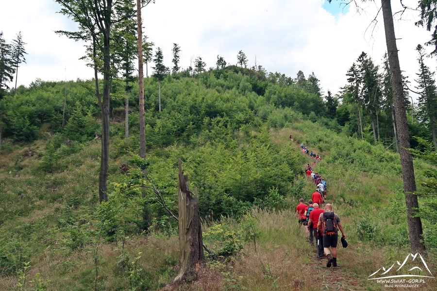 Chwilę później ruszamy w dalszą drogę. Za formacjami skalnymi docieramy do wypłaszczenia, a przed nami otwiera się widok na ostatni fragment podejścia. Przed nami jeszcze spore podejście. Tymczasem ruszamy do góry.