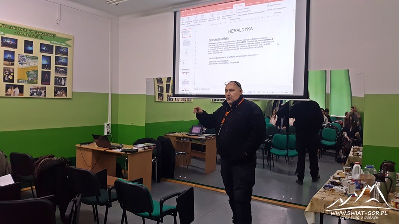 Kolejnym wykładowcą tego dnia był Wojciech Kwiecień – Prezes Klubu Przewodników i Pilotów Wycieczek Ziemi Opolskiej, który zgodnie z planem miał dla nas przeprowadzić zajęcia z zakresu heraldyki. Był to bardzo ciekawy wykład, w trakcie których dowiedzieliśmy się w jaki sposób czytać herby, a także omówiliśmy najważniejsze rody Śląska Opolskiego oraz ich herby. W tym dniu Wojciech Kwiecień wręczył także kol. Mirkowi zaległą odznakę za przejście Głównego Szlaku Świętokrzyskiego. Co było takim miłym akcentem naszych zajęć.