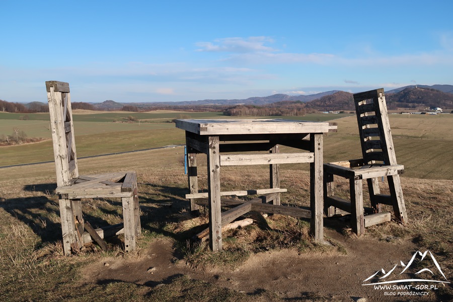 Po 10 minutach spokojnego spaceru z przerwami na robienie pamiątkowych fotek o 15:50 meldujemy się na wzniesieniu Lansky Vrch (423 m.n.p.m.). Jest to wylesione wzgórze pomiędzy miejscowościami Zulova – Bergov – Skorosice przy drodze 60 z Jesenika na Javornik na Przedgórzu Paczkowskim. Cechą charakterystyczną wzniesienia jest znajdujący się tutaj olbrzymi stół z krzesłami, które według informacji z internetu są dziełem nieformalnej grupy młodzieży z Czech.