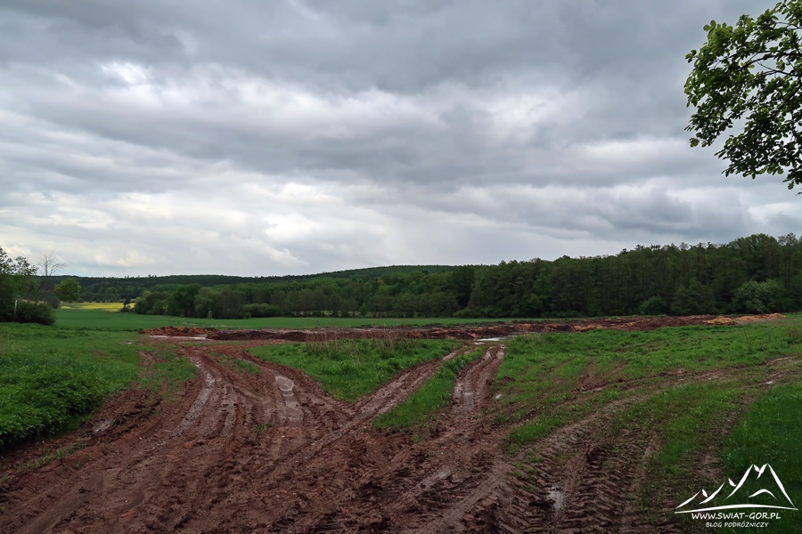 W niedzielę (16.05.2021 r.) dosyć późno, bo po godzinie 11:00 ruszam z Nysy w kierunku Prudnika, skąd dalej kieruję się do Trzebini, czyli dawnego uzdrowiska. Odpuszczam sobie zwiedzanie miejscowości, ale kieruję się ze wsi polną drogą tuż obok boiska do skrzyżowania dróg polnych (miejsce startu na mapie). Tutaj jest sporo miejsca, aby zostawić samochód, przede mną znajduje się tablica Obszaru Natura 2000 Góry Opawskie. Wysiadam, zabieram plecak i ruszam na spacer nieoznakowaną ścieżką, bowiem na oba szczyty nie prowadzi znakowany szlak turystyczny.