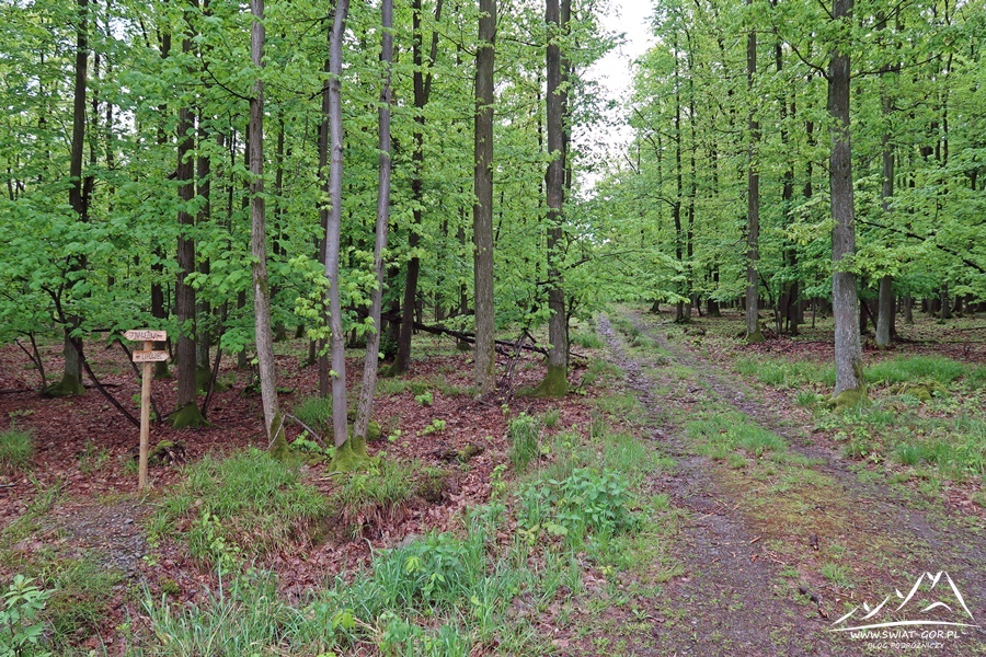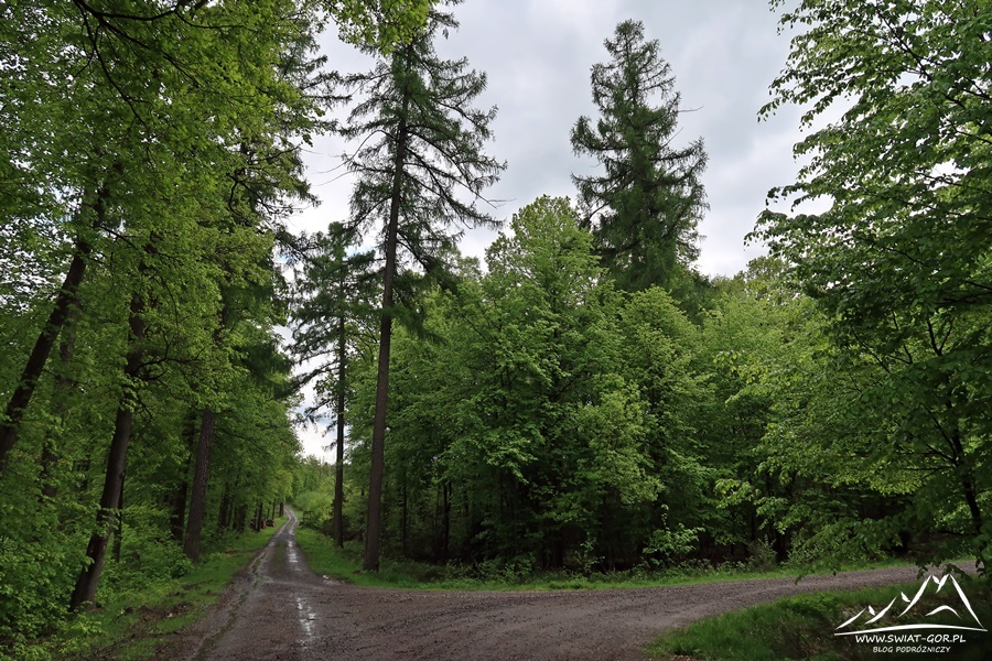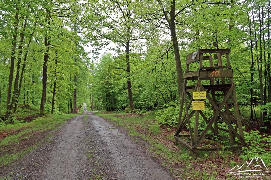 Wędruję spokojnie leśną drogą, która początkowo niestety pełna jest błota. Docieram do pierwszej polany widokowej, gdzie przede mną pojawia się panorama w kierunku Wężowej (362 m n.p.m.). Robię kilka zdjęć i idę dalej. Po drodze mijam liczne ambonki, a kilkadziesiąt metrów za amboną z numerem 10 docieram do skrzyżowania dróg. Według mapy tutaj mam skręcić w prawo w kierunku mojego pierwszego celu, czyli Lipowca (370 m n.p.m.).