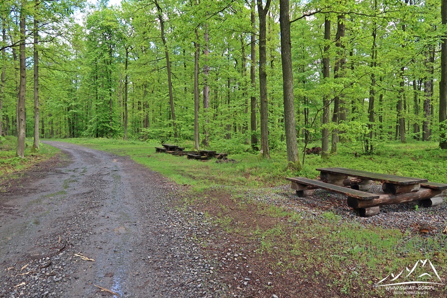 Chwila na szczycie i czas ruszać w dalszą drogę. Wracam tą samą drogą do wspomnianego wcześniej skrzyżowania, gdzie skręcam w prawo i dalej kieruję się w stronę Gajnej (362 m n.p.m.). Po drodze mijam kolejne ambonki, docieram do takiego łuku wiodącym w lewo. Tutaj znajdują się ławki i stoły, także jest to dobre miejsce na odpoczynek. Ja jednak idę dalej w stronę szczytu, a po drodze mijam polanę powstałą po wycince drzew.