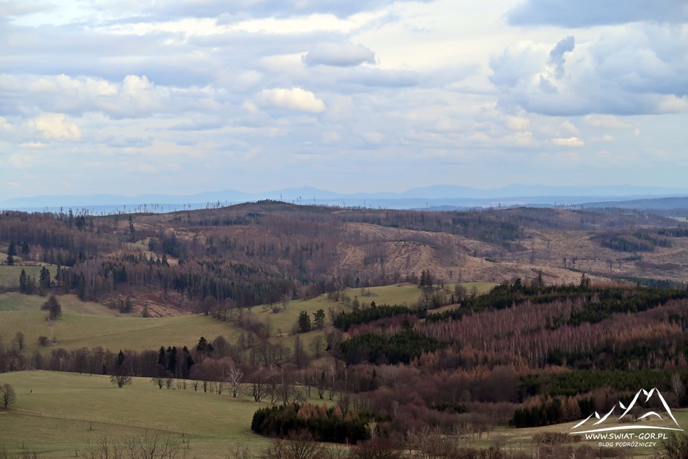 Nieco dalej w kierunku już północnym otwiera się widok na pasmo Gór Opawskich. Widać bardzo dobrze Pricny Vrch (975 m n.n.p.m.), Koncine (888 m n.p.m.), Kutny Vrch (870 m n.p.m.), Solną Horę (867 m n.p.m.) czy Jindrichova Vyhlidke (795 m n.p.m.).