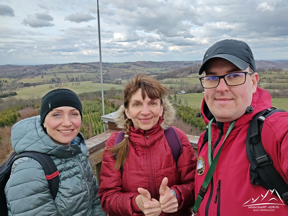 Widoki z wieży są niesamowite, a nam świetnie sprawdziła się w analizie panoramy aplikacja Peak Finder. Oczywiście pamiątkowe selfie też wpada, ale czas kończyć naszą wycieczkę. Masyw Pradziada chowa się w chmurach deszczowych, które są już coraz bliżej nas. Także schodzimy na dół i szybkim krokiem ruszamy w kierunku samochodu.