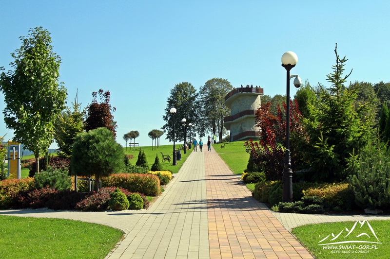 Sam park w Muszynie jest bardzo ciekawie położony bowiem leży on na wzgórzu i nie jest to typowy park tylko jest to otwarta przestrzeń z licznymi miejscami odpoczynkowymi i ścieżkami oraz wieżą widokową, wszystko to tworzy tzw. ogrody zmysłów. Jest, gdzie spacerować, a żeby przejść całe ogrody trzeba by tutaj spędzić cały dzień. Oczywiście odwiedzam wieżę widokową na której spędzam trochę czasu, z wieży wyłaniają nam się wspaniałe widoki na Muszynę, Jaworzynę Krynicką czy Tatry. Robię sobie pamiątkowe zdjęcia i ruszam w dalszą drogę. Schodzę z ogrodów od drugiej strony tak aby odwiedzić jeszcze pijalnię, w której zaopatruję się oczywiście w słynną „Muszyniankę”.