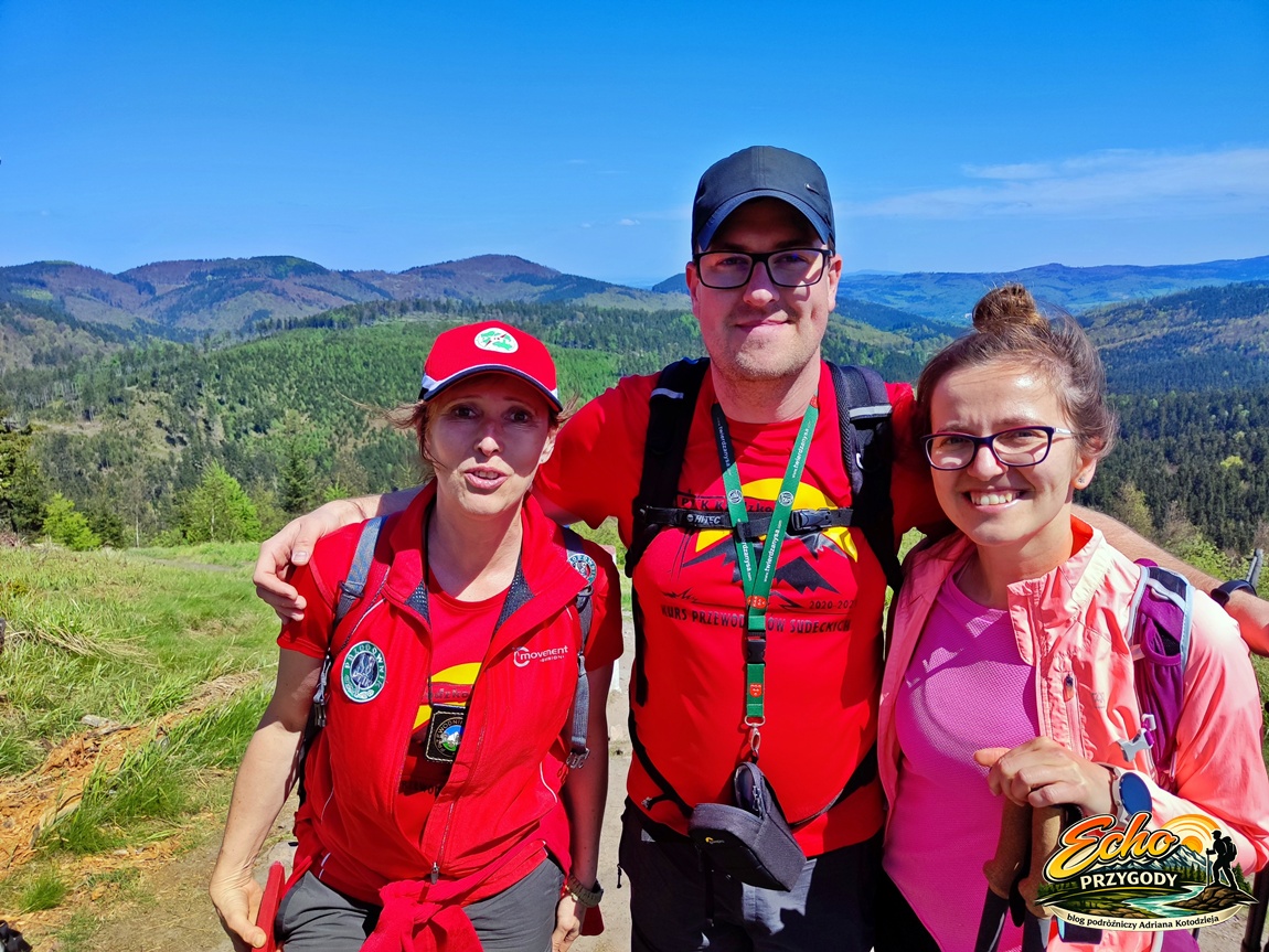 Po dłuższym odpoczynku ruszamy w drogę powrotną. Monia i Michał do Sokołowska, a my z Patrycją i Klaudią na Przełęcz Trzech Dolin. Ruszając, szczyt opuszcza także grupa turystów, jak się okazuje prowadzi ją przewodniczka i przy zejściu okazuje się, że jest nią Asia Wielgus nasza kursowa koleżanka. Siedzieliśmy kilka metrów od siebie i nie poznaliśmy się – świat potrafi zaskakiwać. Robimy pamiątkowe zdjęcie, wymieniamy uprzejmości i ruszamy w drogę.