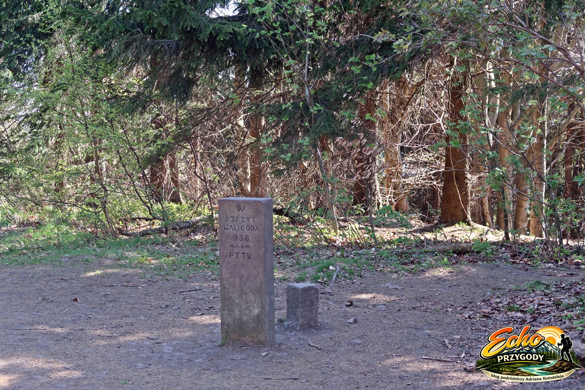 Zostawiamy głaz za sobą i ruszamy na szczyt Waligóry za znakami żółtego szlaku turystycznego. Po niecałym kilometrze marszu i kilkudziesięciu metrach przewyższenia meldujemy się na najwyższym wzniesieniu Gór Kamiennych o wysokości 936 metrów.