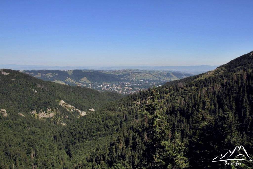 Idąc dalej po chwili pojawiają się widoki na nasz dzisiejszy cel – czyli Sarnią Skałę (1377 m.n.p.m.). Ścieżka schodzi w dół, a następnie prowadzi nas płasko. Pojawiają się liczne widoki na Zakopane. Na trasie położone są drewniane mostki, a my spokojnym spacerkiem pokonujemy ten odcinek i rozpoczynamy ostatnią wspinaczkę na Czerwoną Przełęcz. Jest to przełęcz pomiędzy Sarnią Skałą (1377 m.n.p.m.), a Suchym Wierchem (1539 m.n.p.m.). Znajduje się w grzbiecie oddzielającym Dolinę Białego od Doliny Strążyskiej.