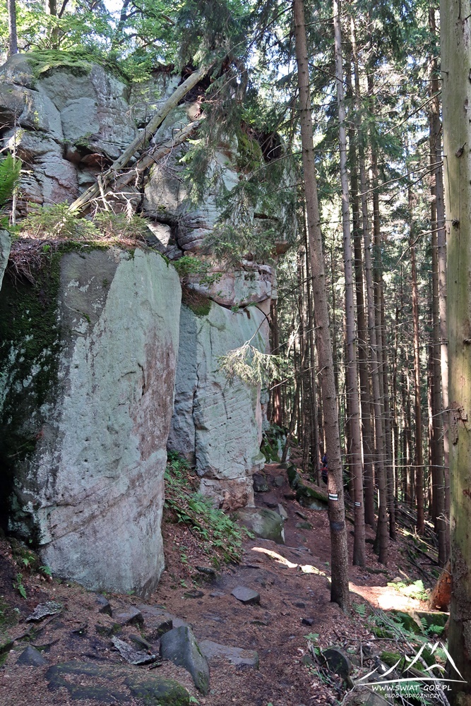 Idąc można doskonale dostrzec to o czym wyżej wspomniałem. Z lewej strony możemy dostrzec potężne bloki piaskowcowe, natomiast z prawej stoki opadają dosyć stromo w kierunku Wambierzyc i Mnicha. Trzeba przyznać, że ten odcinek szlaku jest bardzo interesujący.