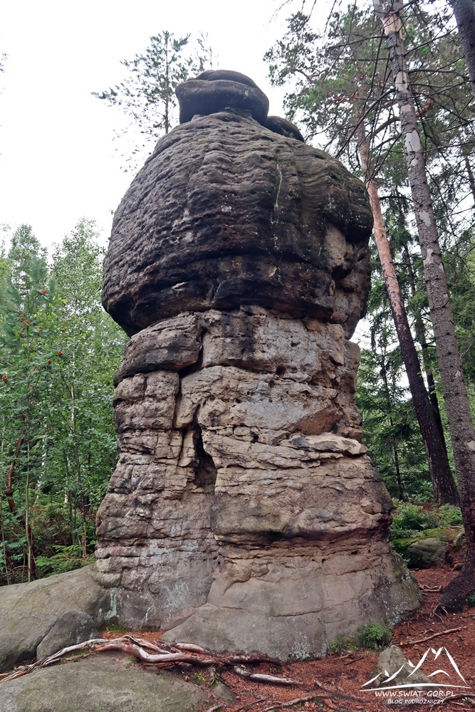 Skalne grzybki co jakiś czas wyłaniają się na szlaku, oczywiście fotografuję je. Trzeba przyznać, że sam szlak jest bardzo malowniczy i można tu spacerować naprawdę długo – gdyby się chciało każdą skałkę dobrze obejrzeć. Kolejną ciekawą formacją na trasie jest Parowóz. To dobre miejsce, gdzie można bliżej przyjrzeć się skutkom działania procesów wietrzenia, czyli niszczenia skały pod wpływem różnorodnych czynników atmosferycznych. Tuż przy parowozie odnajdujemy inną ciekawą formację skalną przy której robimy sobie pamiątkowe zdjęcie.