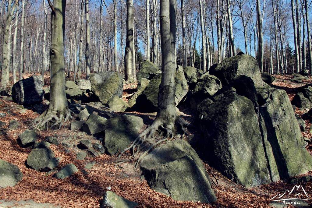 Na przełęczy podejmujemy decyzję, że na szczyt nie ruszymy popularnym żółtym szlakiem tylko skręcimy w lewo i za znakami niebieskiego szlaku ruszymy w stronę Skalnej (522 m.n.p.m.) gdzie znajduje się Zespół Przyrodniczo-Krajobrazowy. Pozostawiamy więc przełęcz, tłumy ludzi i ruszamy spokojną drogą przed siebie. Sam szlak okazuje się dość ciekawy, a to ze względu na towarzyszące nam liczne formacje skalne. Przez nie co chwilę zatrzymujemy się aby zrobić jakieś zdjęcia . Jak się okazuje szlak wiodący tutaj ma swoją nazwę – Skalna Perć i wiedzie on przez wierzchołek Skalnej oraz grupę Olbrzymków na wierzchołek Ślęży. Z początku ścieżka prowadzi nas dość płasko, jednakże co jakiś czas pojawiają się większe podejścia (wszak mamy do pokonania 334 m przewyższenia, cały czas płasko nie będzie). Na niebie brak jakichkolwiek chmur, jest ciepło – na tyle, że można ściągnąć kurtki i wędrować w bluzach.